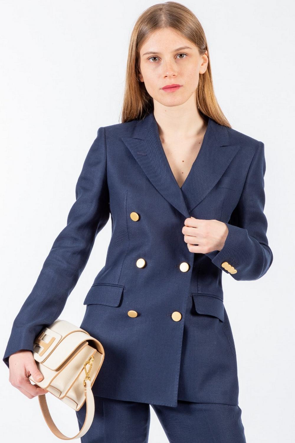 Tailleur con pantalone in lino blu. Giacca blazer doppiopetto con chiusura a tre bottoni piatti in metallo oro satinato. Collo con revers a lancia. Due tasche frontali con pattina e taschino tagliato al petto. Spacco posteriore. Foderata. Pantalone a sigaretta con piega centrale stirata. Chiusura con zip e gancetto. Tasche laterali oblique e tasche posteriori a doppio filetto.