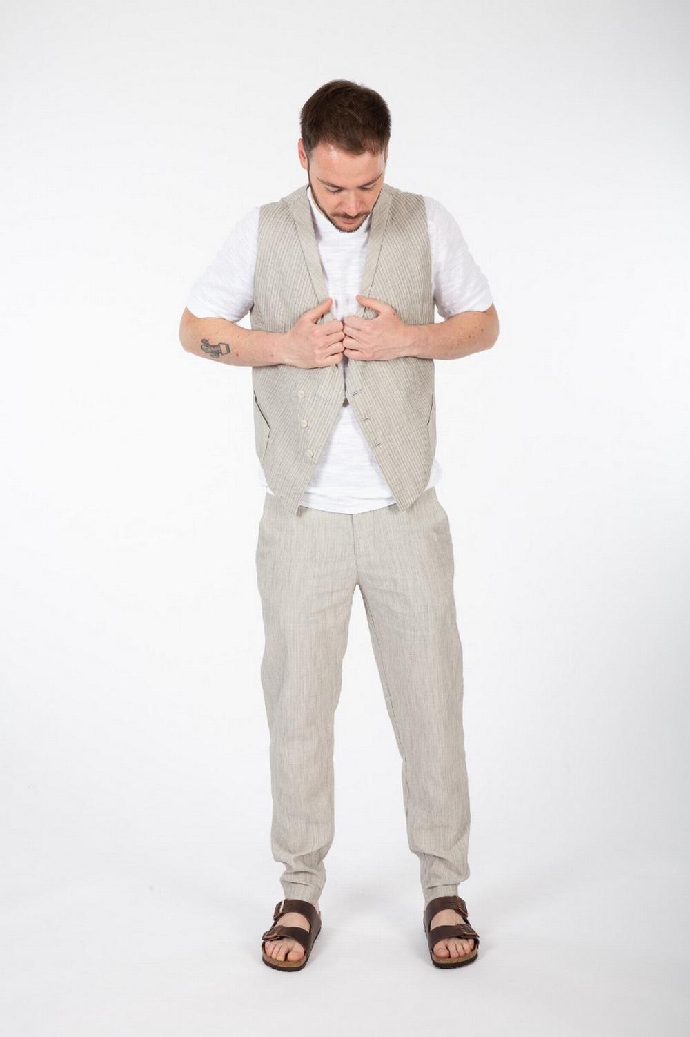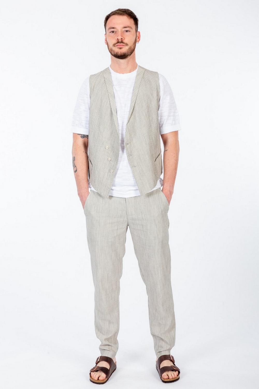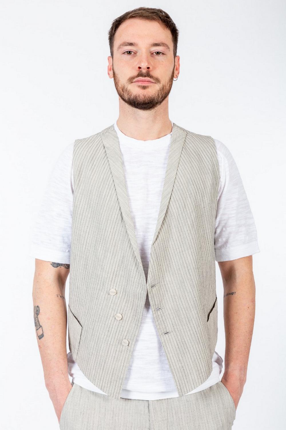 Gilet in misto lino color sasso con lavorazione a righe verticali. Chiusura a tre bottoni. Revers stretto. Due taschine diagonali sul fondo.