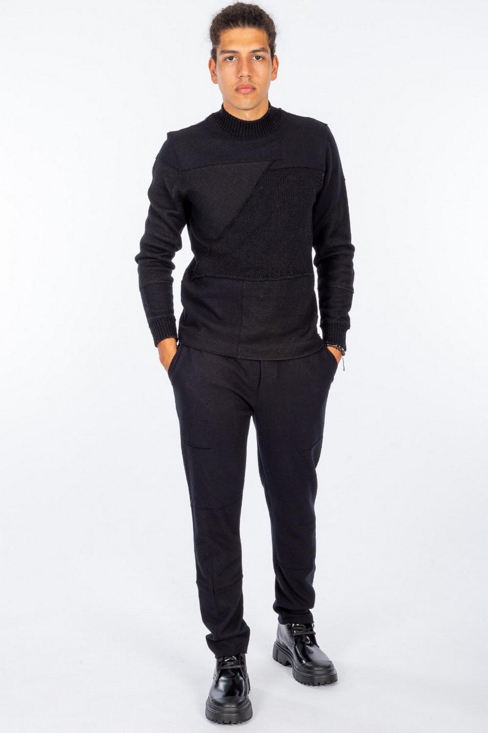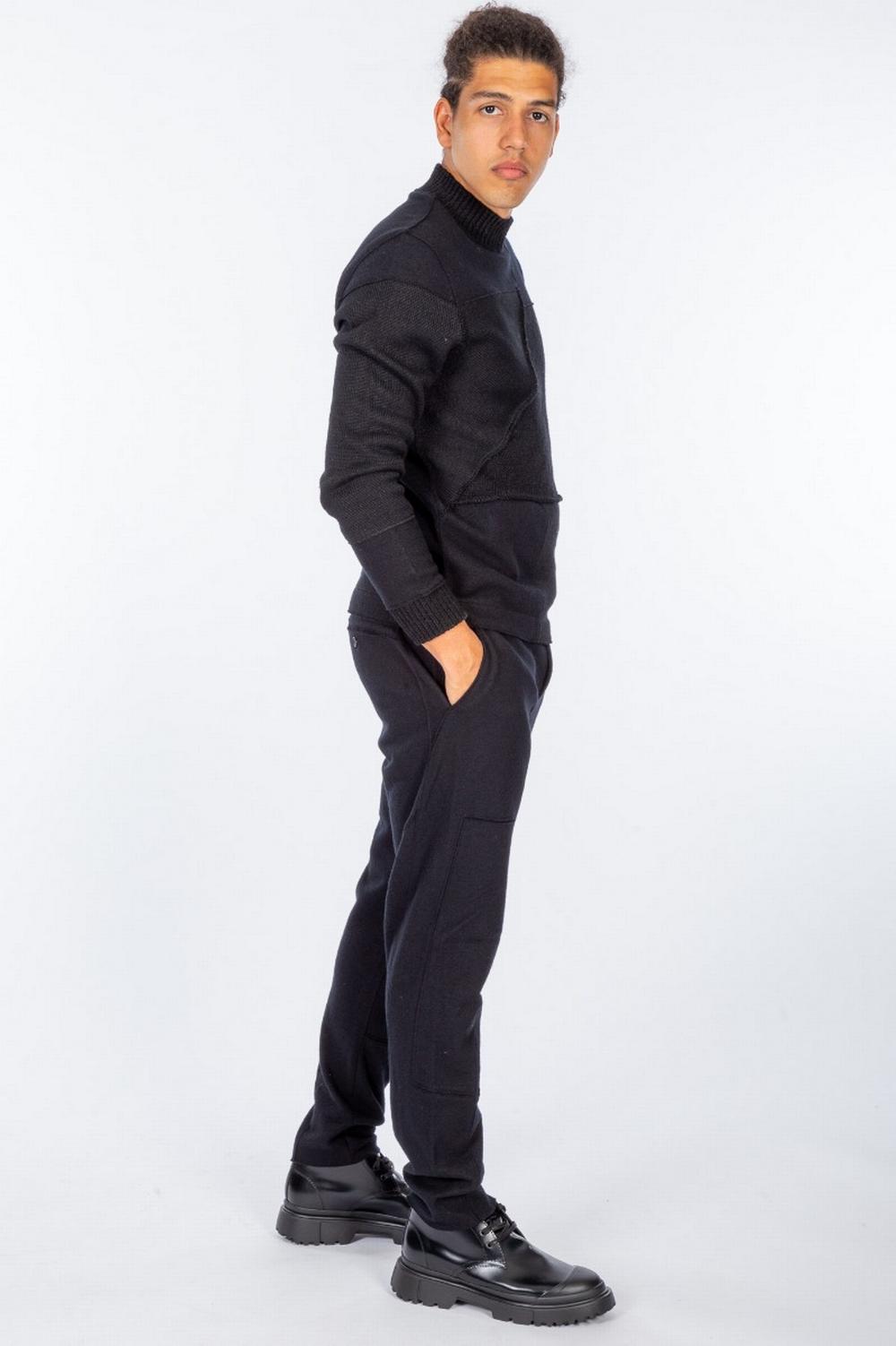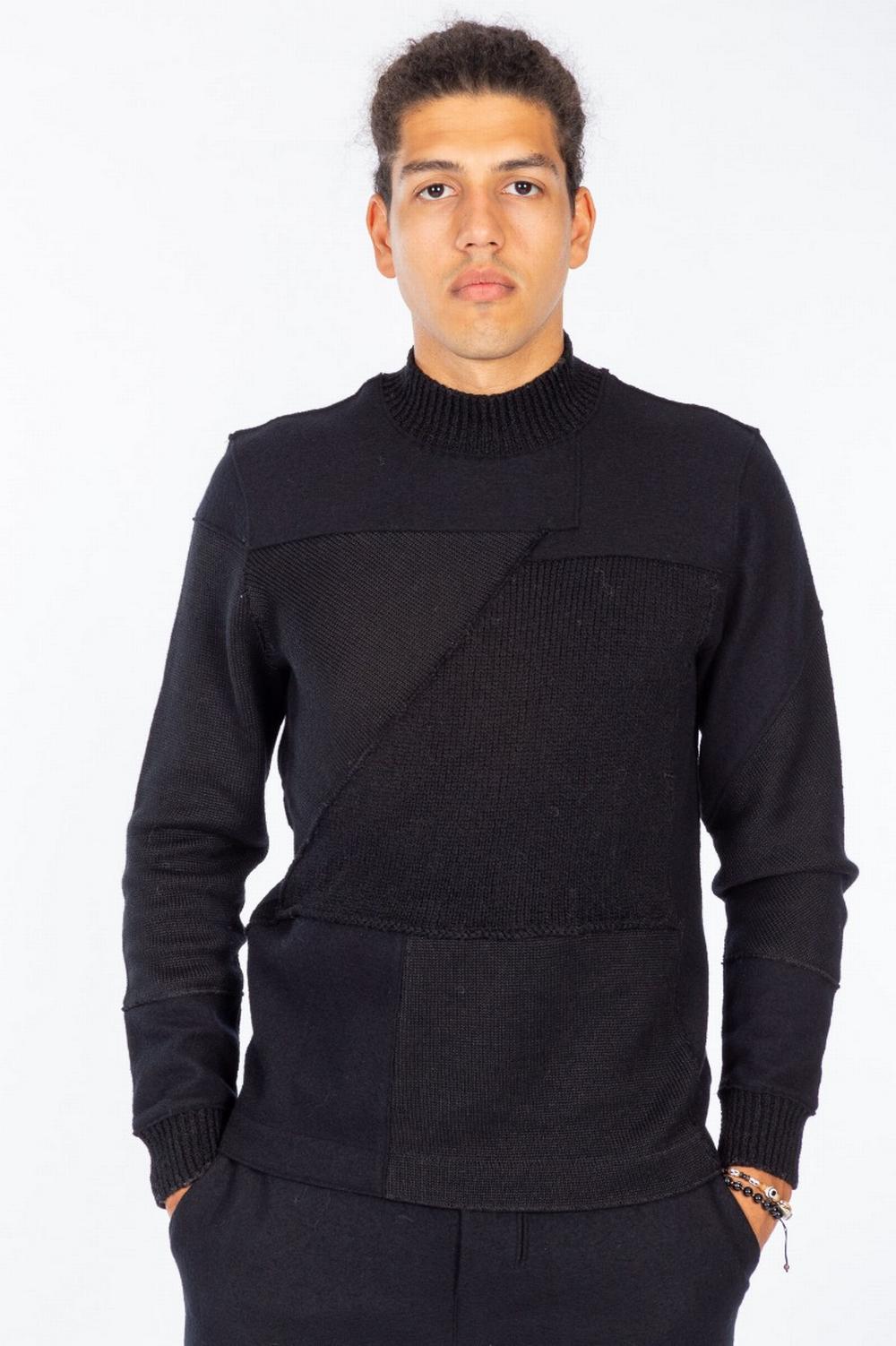 Maglia in panno e filato di lana e lino di colore nero. Composta da diverse sezioni che creano un effetto patchwork: panno, filato di lana ultra light, filato più pesante. Scollo vulcano. Collo e polsi a costina.