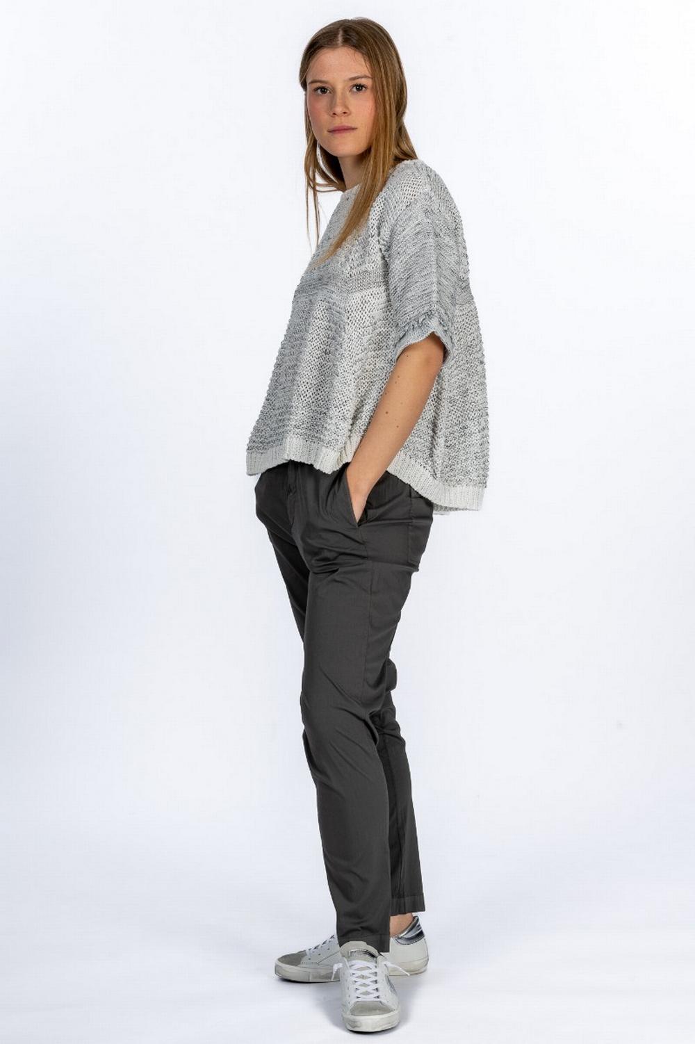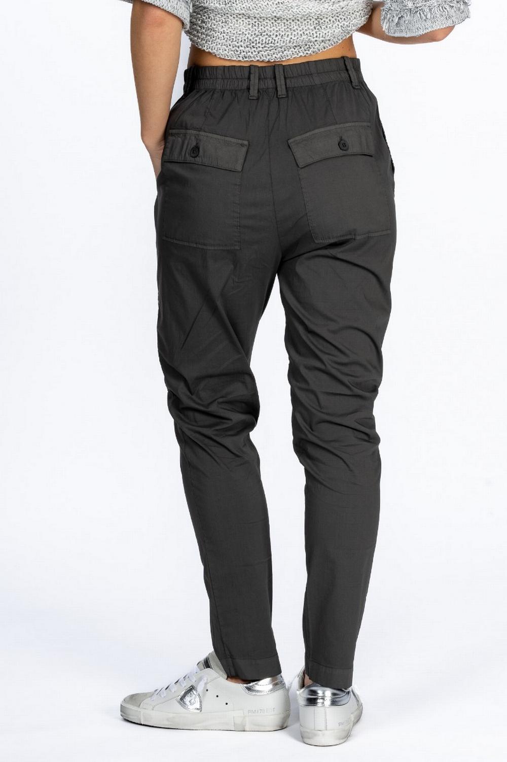 Pantalone in misto cotone, leggermente elasticizzato, color grigio militare. Tessuto molto leggero e fresco, leggermente lucente alla vista. Chiusura con zip e bottone, elastico e passanti in vita. Linea carrot con cavallo rilassato. Due tasche laterali verticali e tasche posteriori applicate con patta di chiusura e bottone.