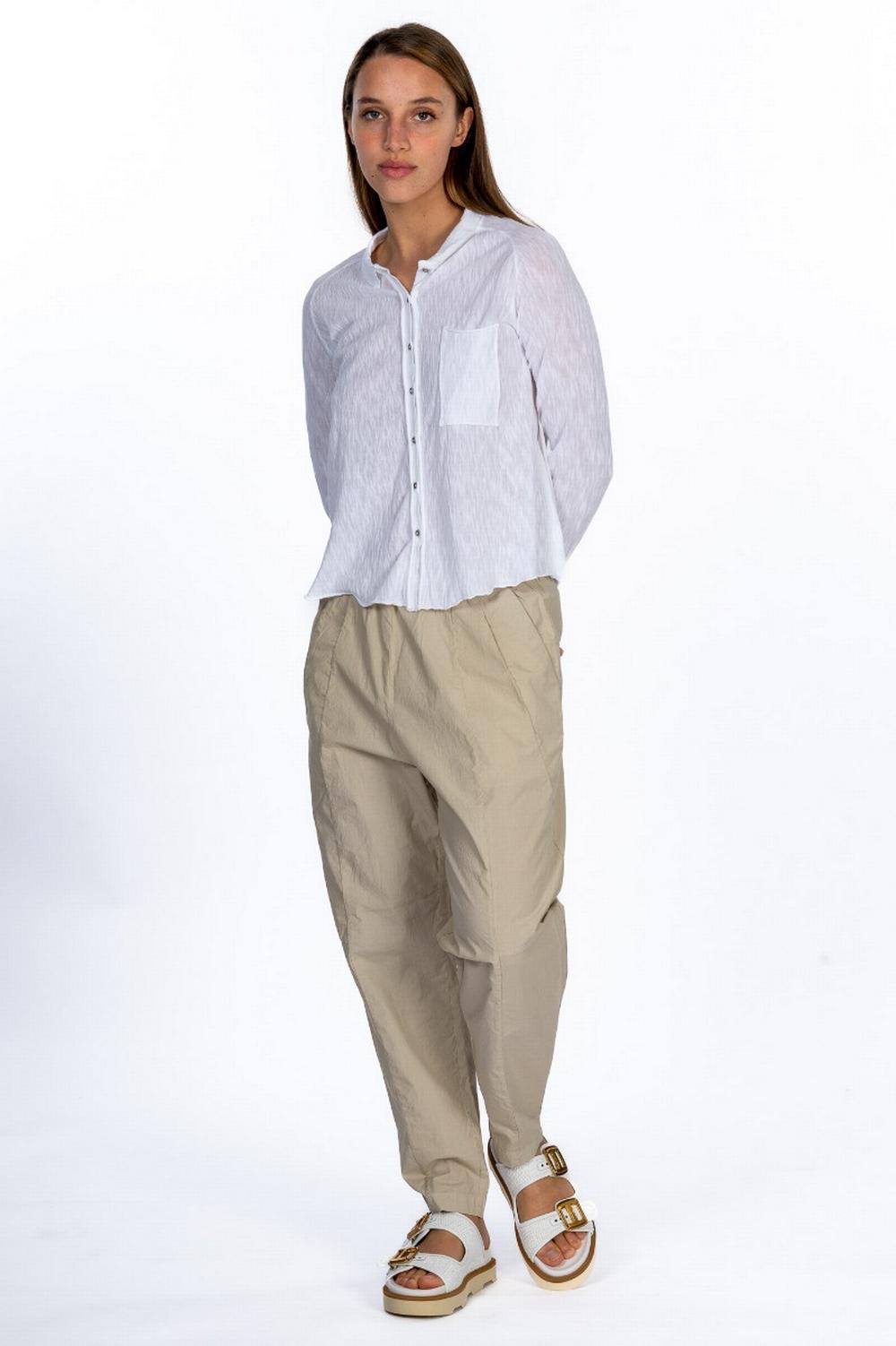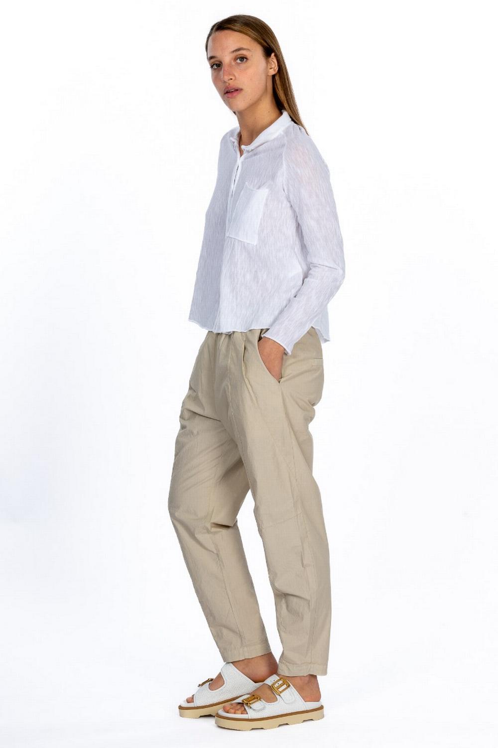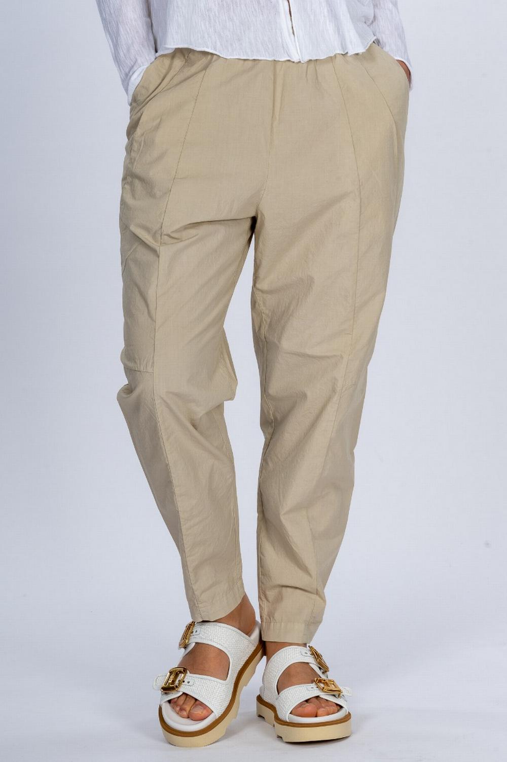 Pantalone in fresco e leggero cotone color sabbia. Linea a carota, morbida. Cavallo rilassato. Elastico in vita. Due tasche laterali america e finte tasche posteriori a filetto. Pence sulla gamba.