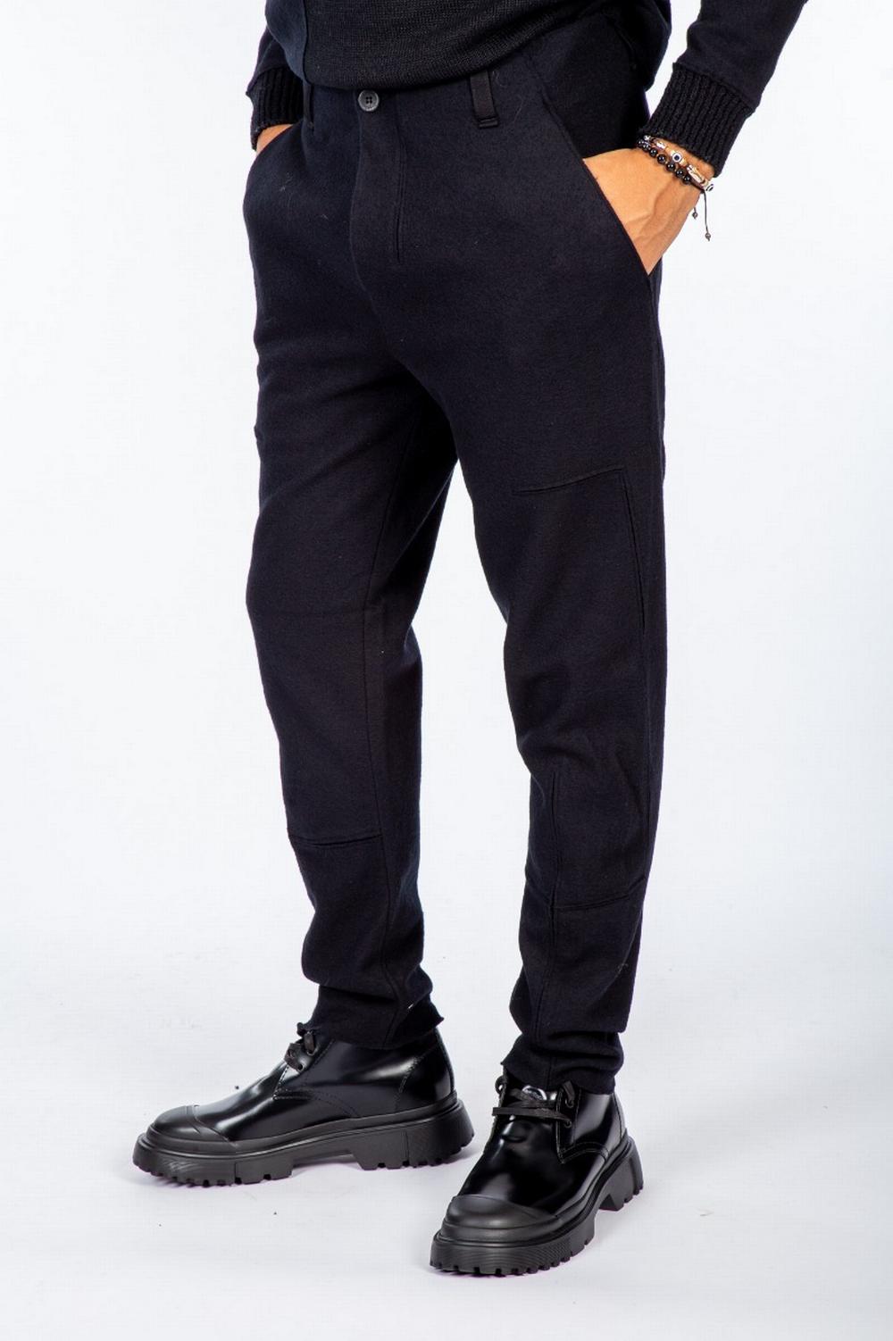 Pantalone chino in panno di lana vergine di colore nero. Vita regular, chiusura con bottoni nascosti, passanti in vita di fettuccia. Due tasche laterali america e due tasche posteriori a filetto con bottone di chiusura. Gamba ergonomica con motivi a taglio vivo.