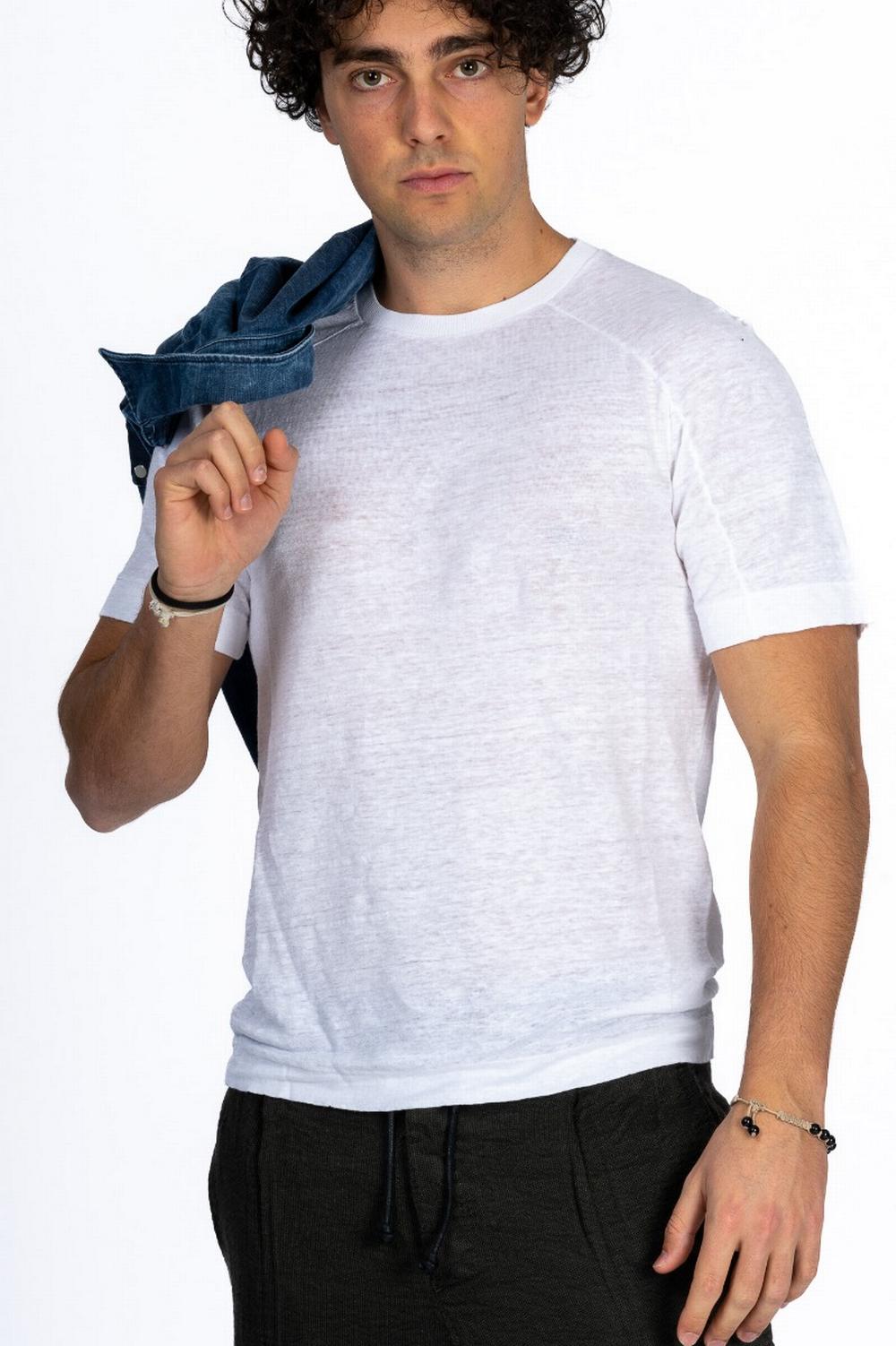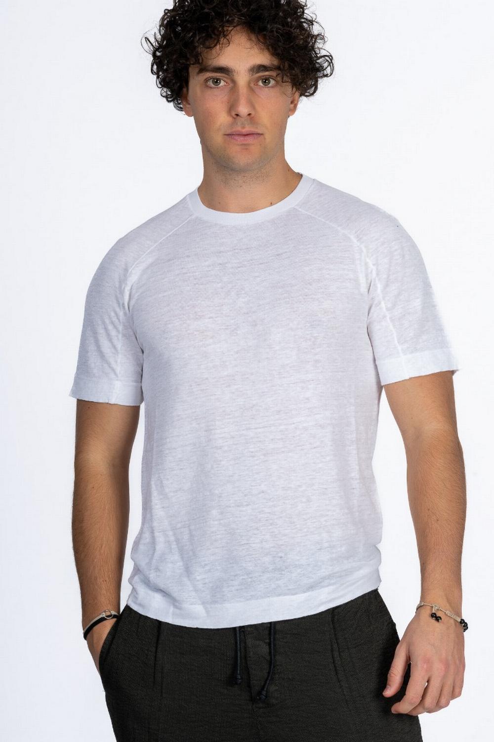 T-shirt in canapa di colore bianco. Scollo a giro in costina di cotone. Maniche alla raglan. Maniche corte. Fondo manica e fondo con orlo alto.