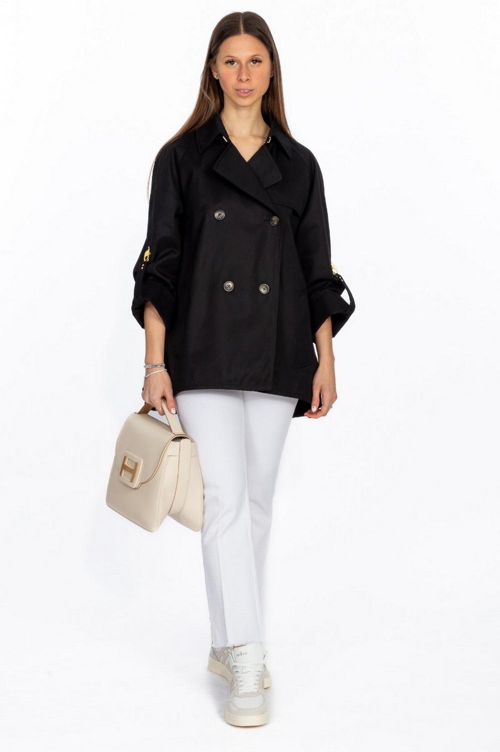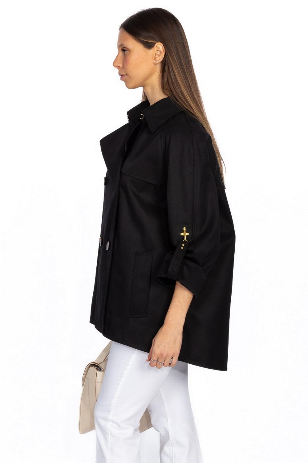 Trench corto doppiopetto in cotone tecnico idrorepellente color nero. Chiusura con bottoni e cintura. Fondo leggermente più lungo sul retro. Pettorina posteriore. Maniche raglan con iconici ganci Fay a fermare le maniche risvoltate. Tasche laterali con filettone. Semi foderato.