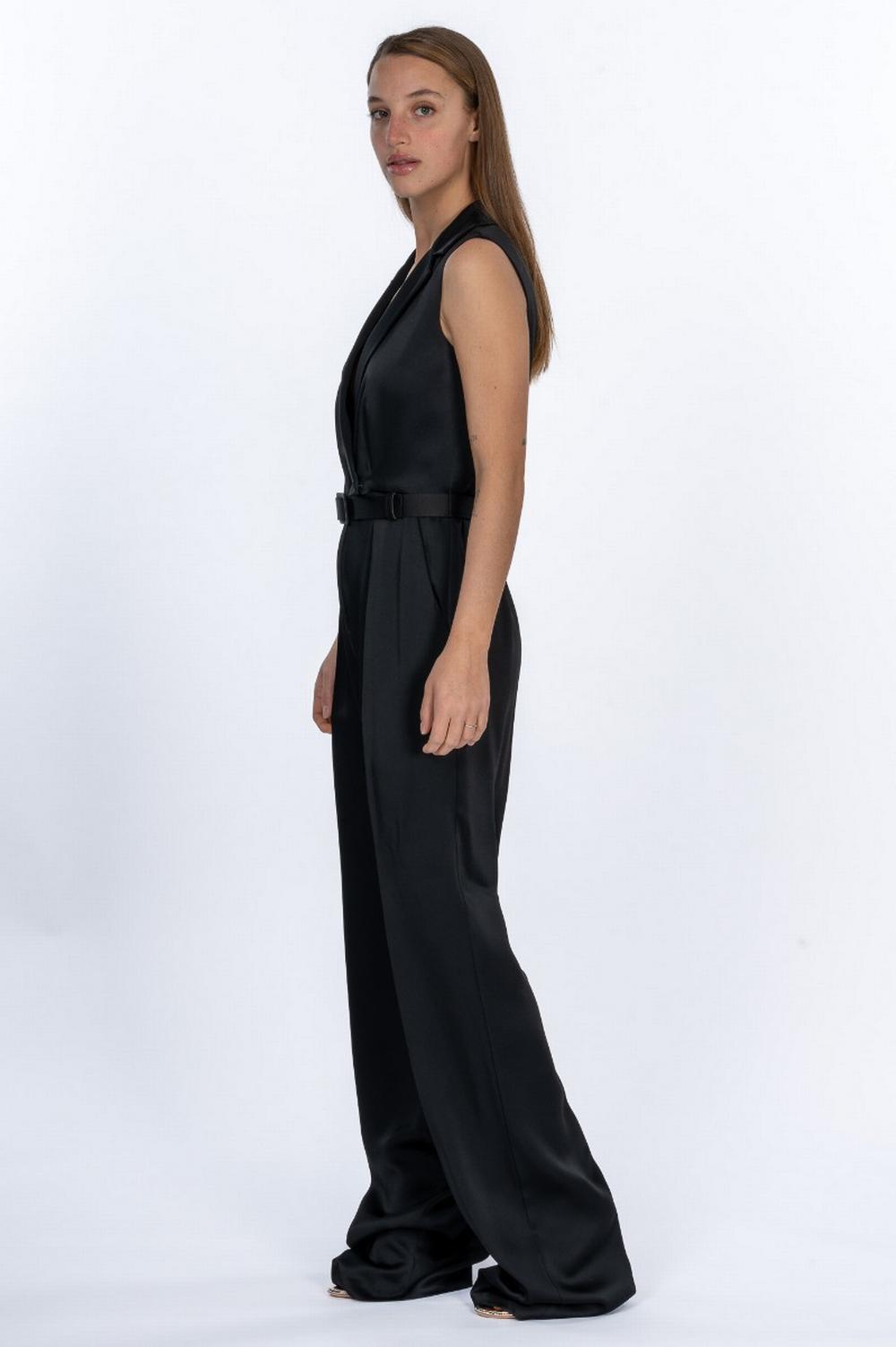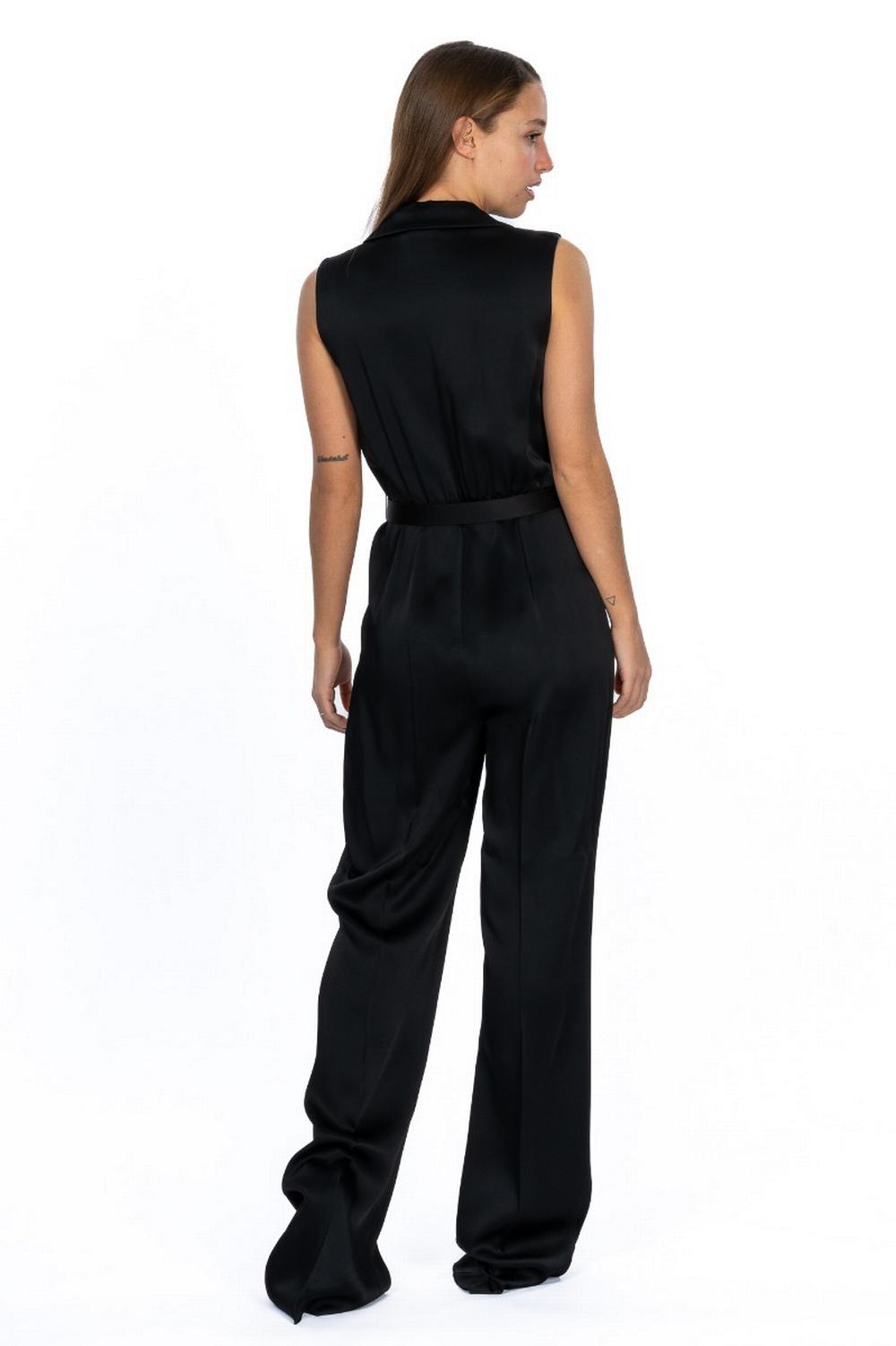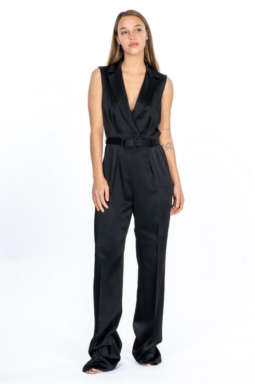 Tuta in satin lucido nero, effetto smoking. Il corpetto con scollo a V incrociato, con revers classico. Smanicata con spalla larga. Pantaloni dalla linea dritta, con pince e piega centrale stirata. Tasche laterali alla francese. Cintura abbinata.