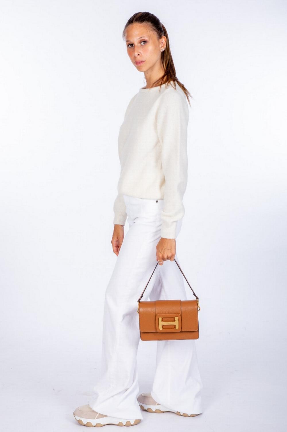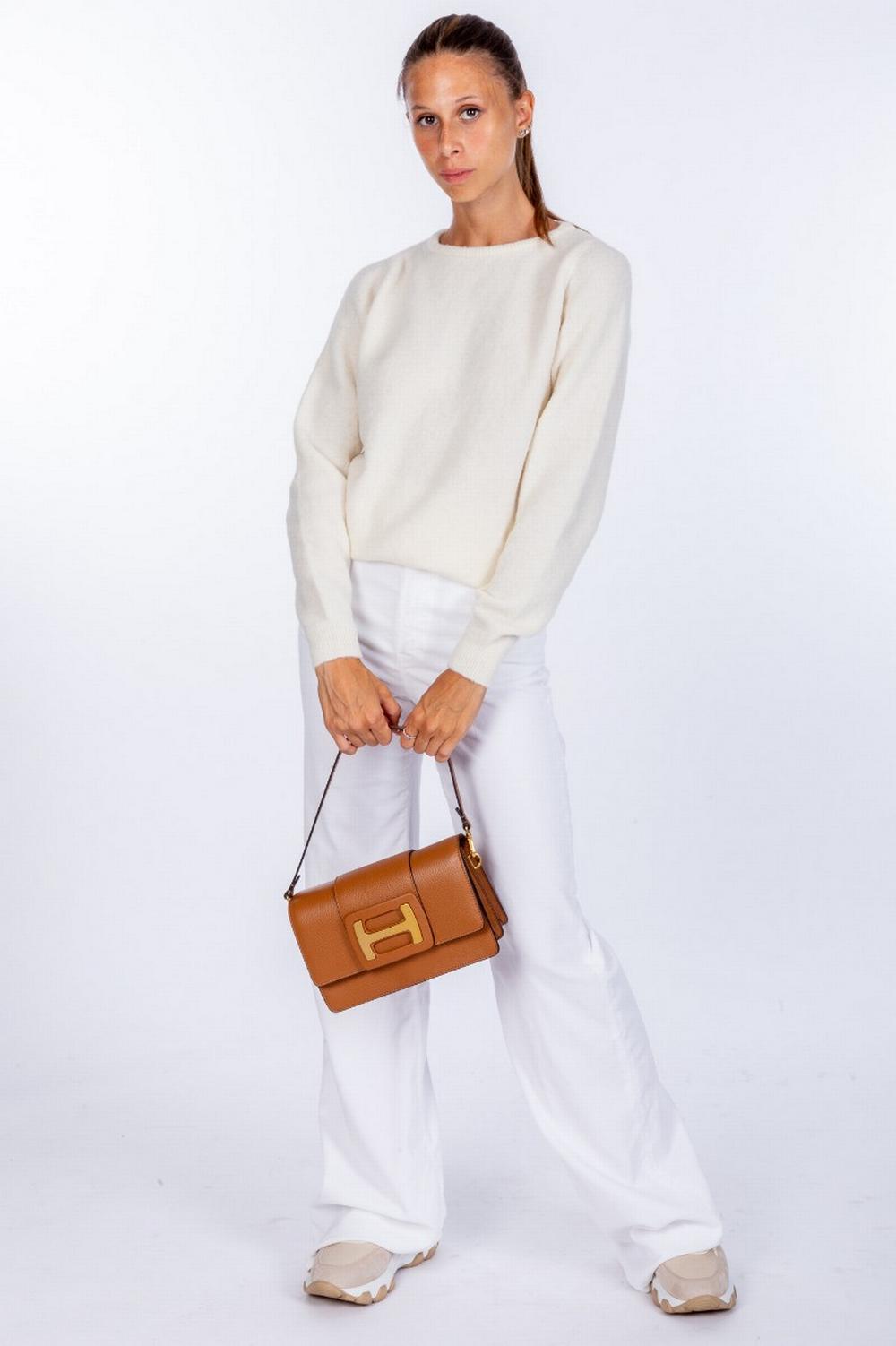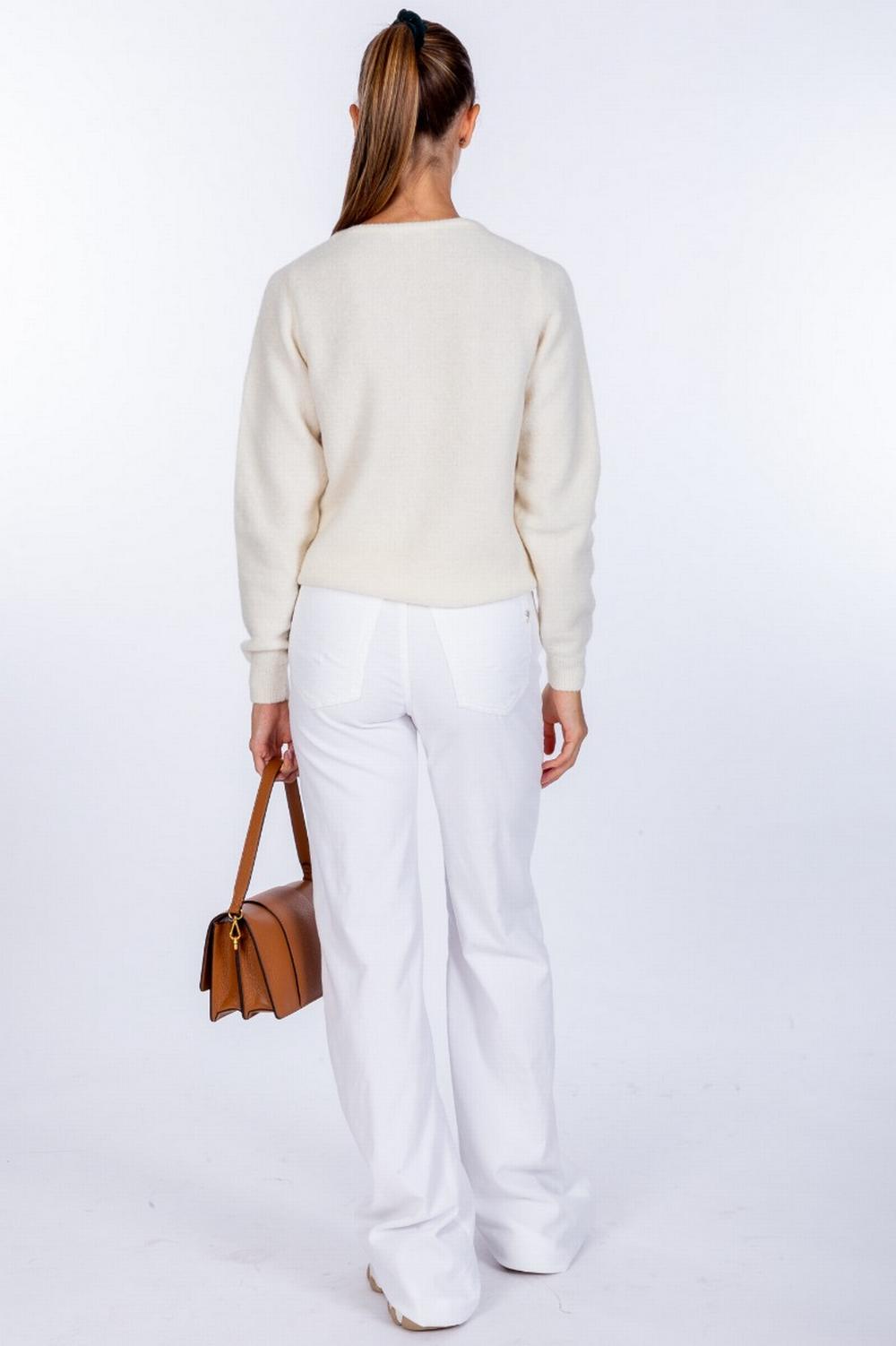 Maglione in filato di misto alpaca leggermente elasticizzato. Colore bianco panna. Scollo a giro. Vestibilità regolare leggermente sciancrato. Polsi, collo e fondo in costina.