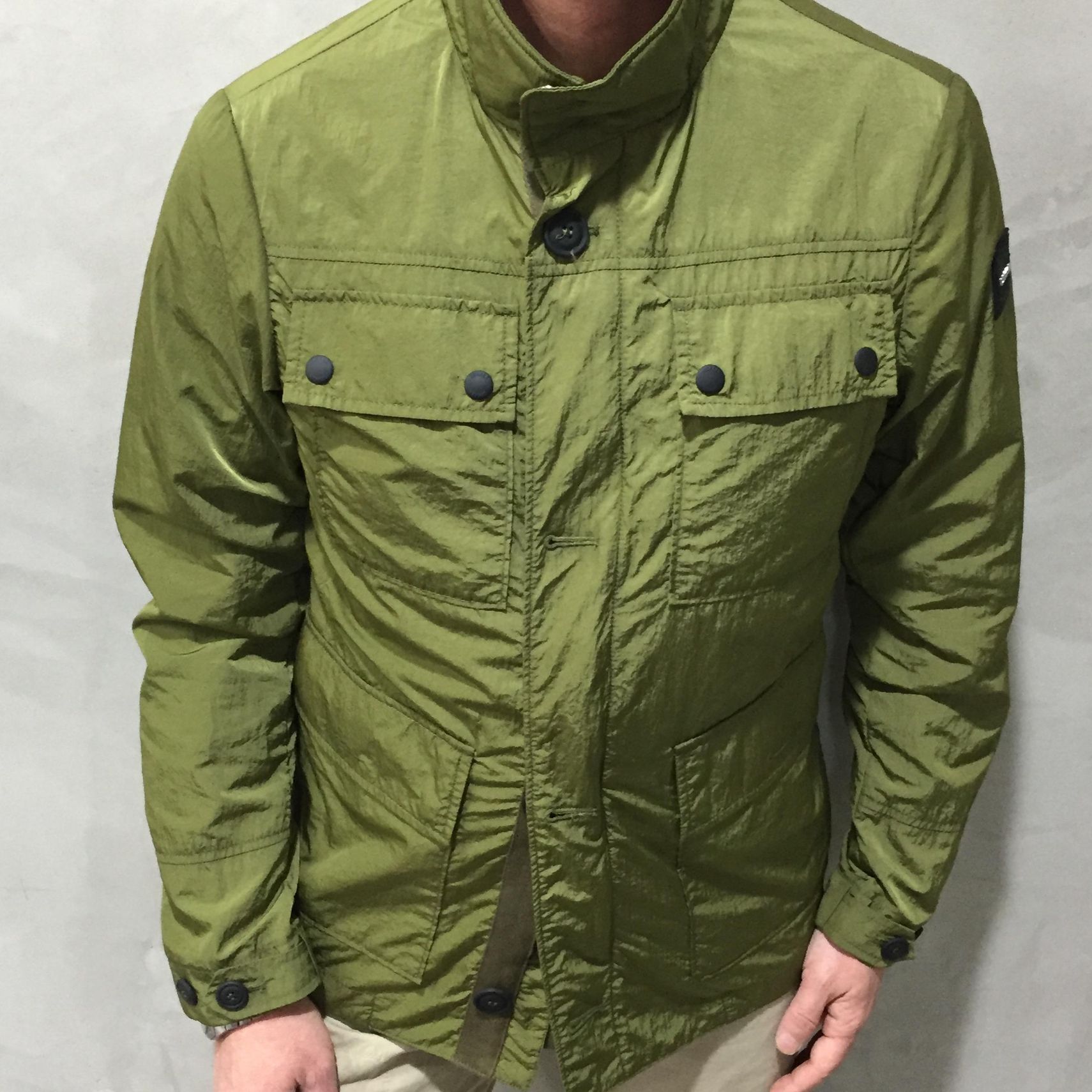 Giacca giubbotto in naylon, chiusura centrale con bottoni e zip, maniche regolabili, collo pieghevole con chiusura bottoni.
